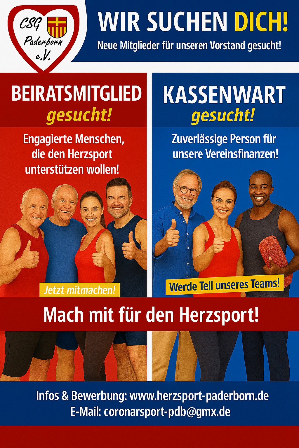 Wir suchen ab sofort Übungsleiter*innen mit der Lizenz "Innere Medizin" zur Leitung unserer Herzsportgruppen (von einer oder mehreren Gruppen, als Springer im Ahornsportpark oder an der Universität Paderborn). Bei Interesse oder Fragen bitte jederzeit melden unter: